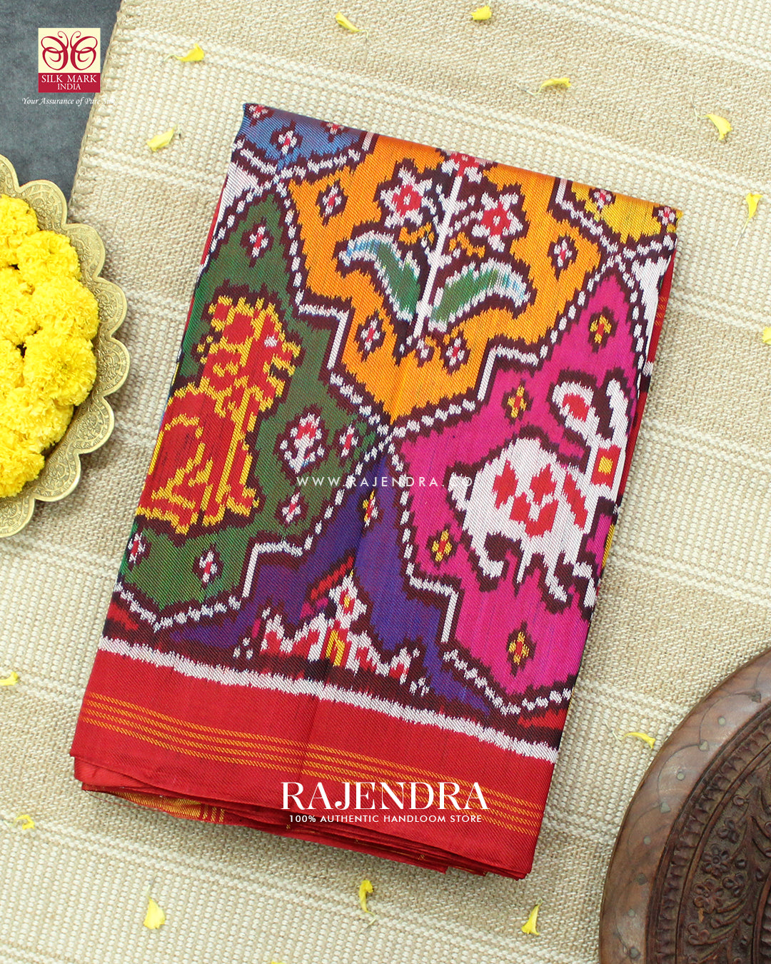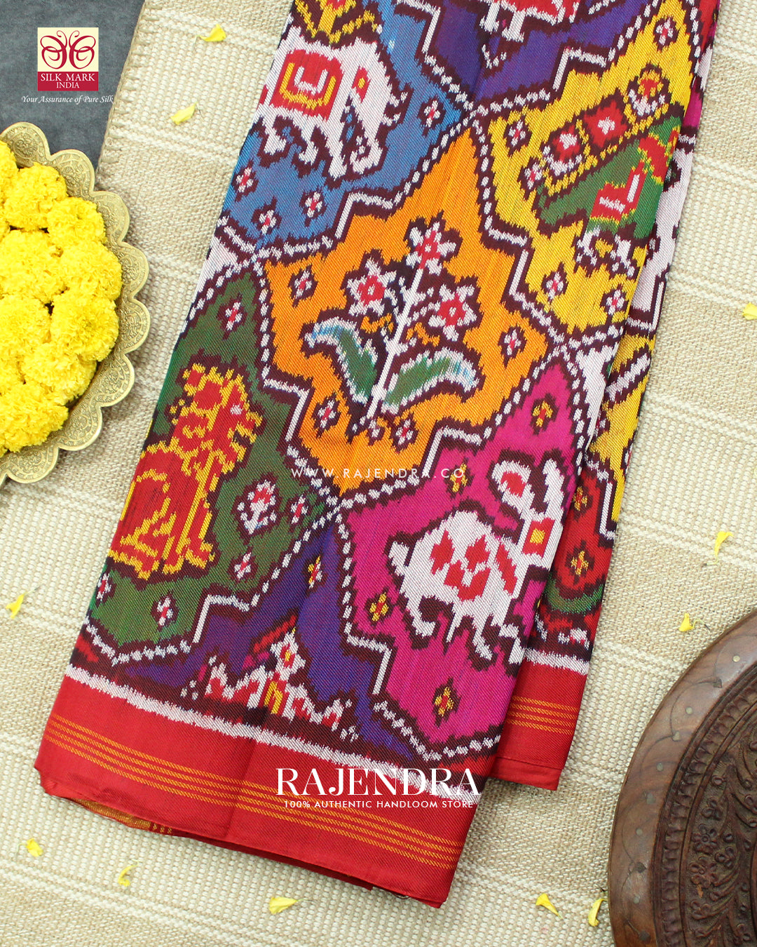 We are govt. approved silk mark certified store for heirloom rajkot patola saree. Authentic silk mark tag with all purchase and secure payment options. Whenever you buy silk make sure it has a silk mark label. The only symbol of purity of silk: the silk mark label. Rajendra Patola assures 100% Silk with Silk mark label.