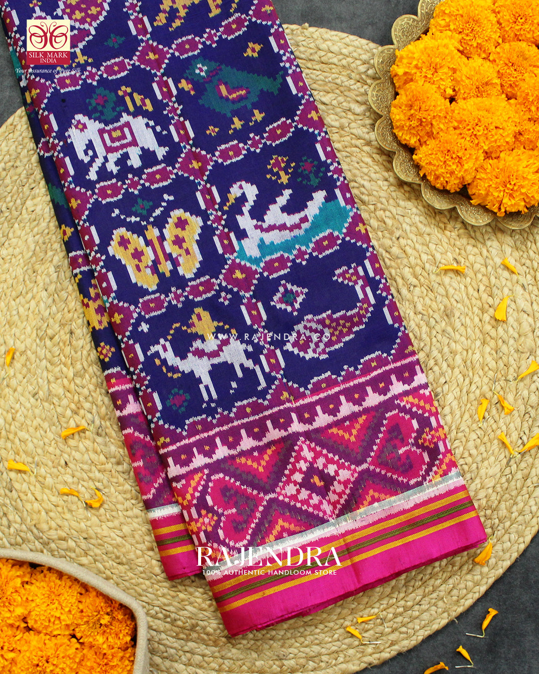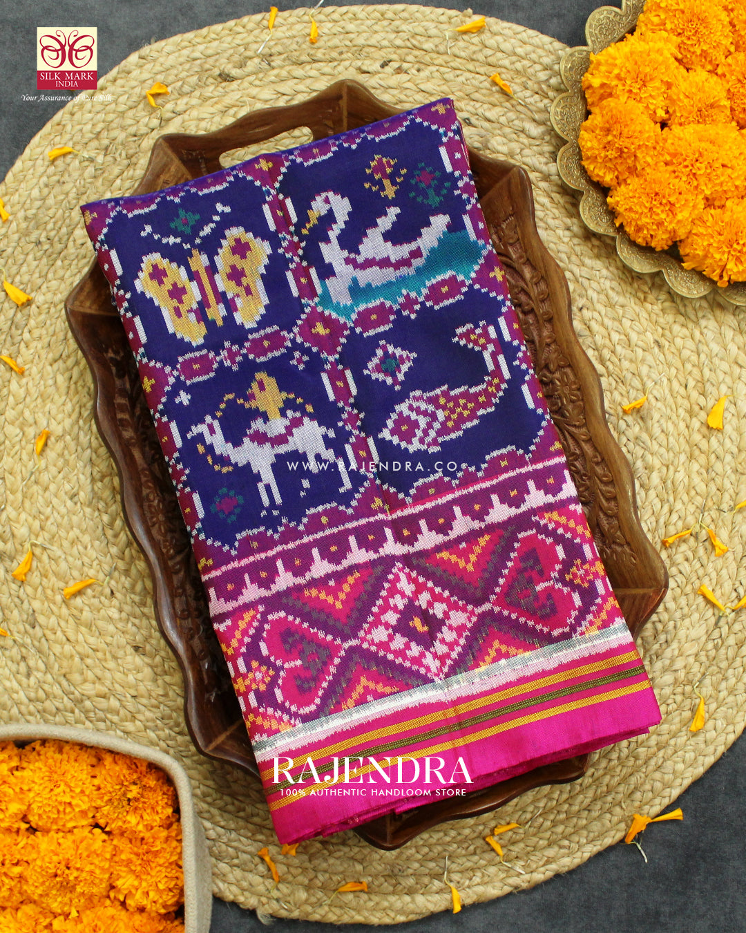 Exclusive 8 Figure Pink and Blue Ikat Rajkot Patola Saree
