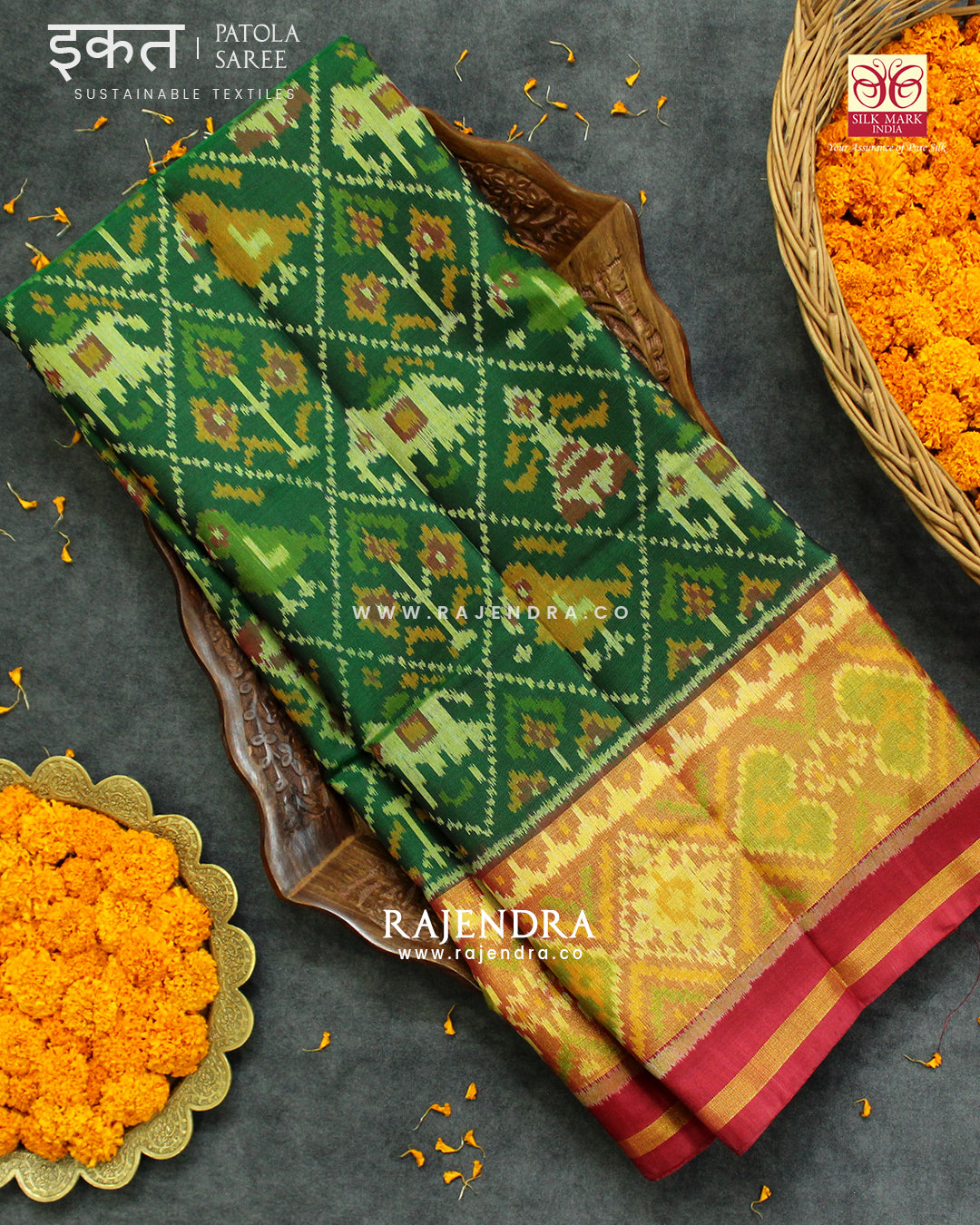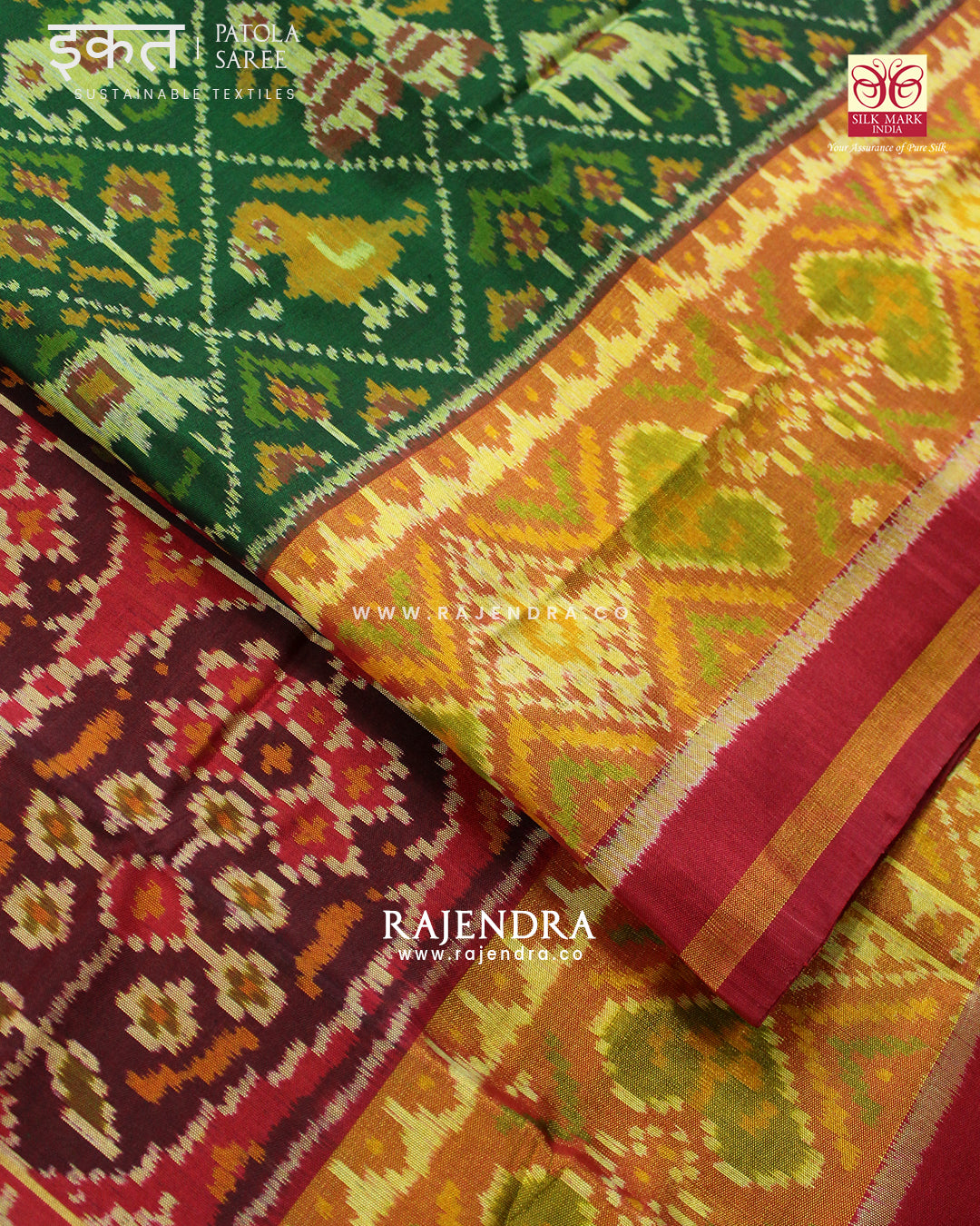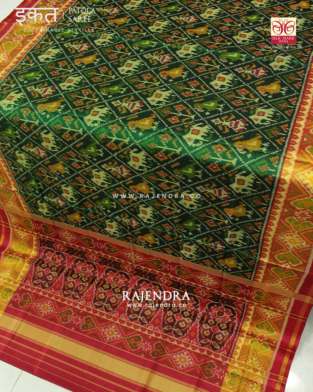 Traditional Elephant and Parrot Motif Red and Green Single Ikat Rajkot Patola Saree