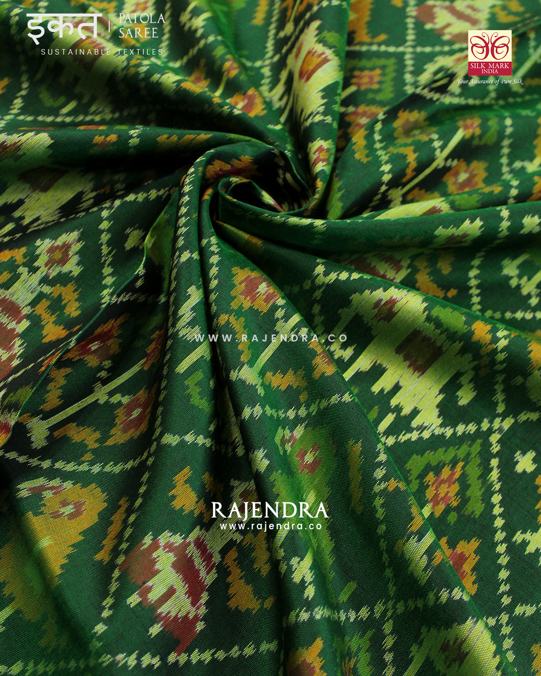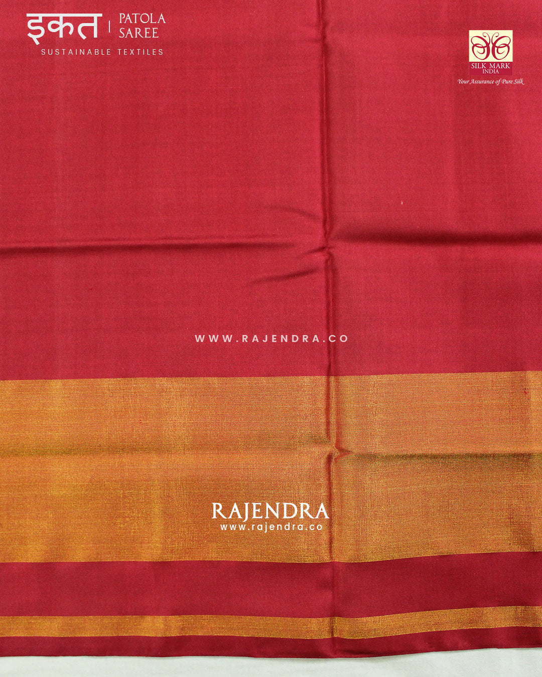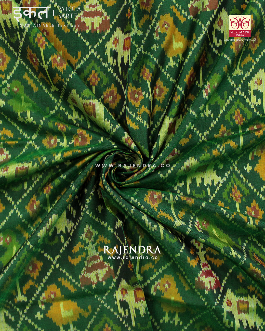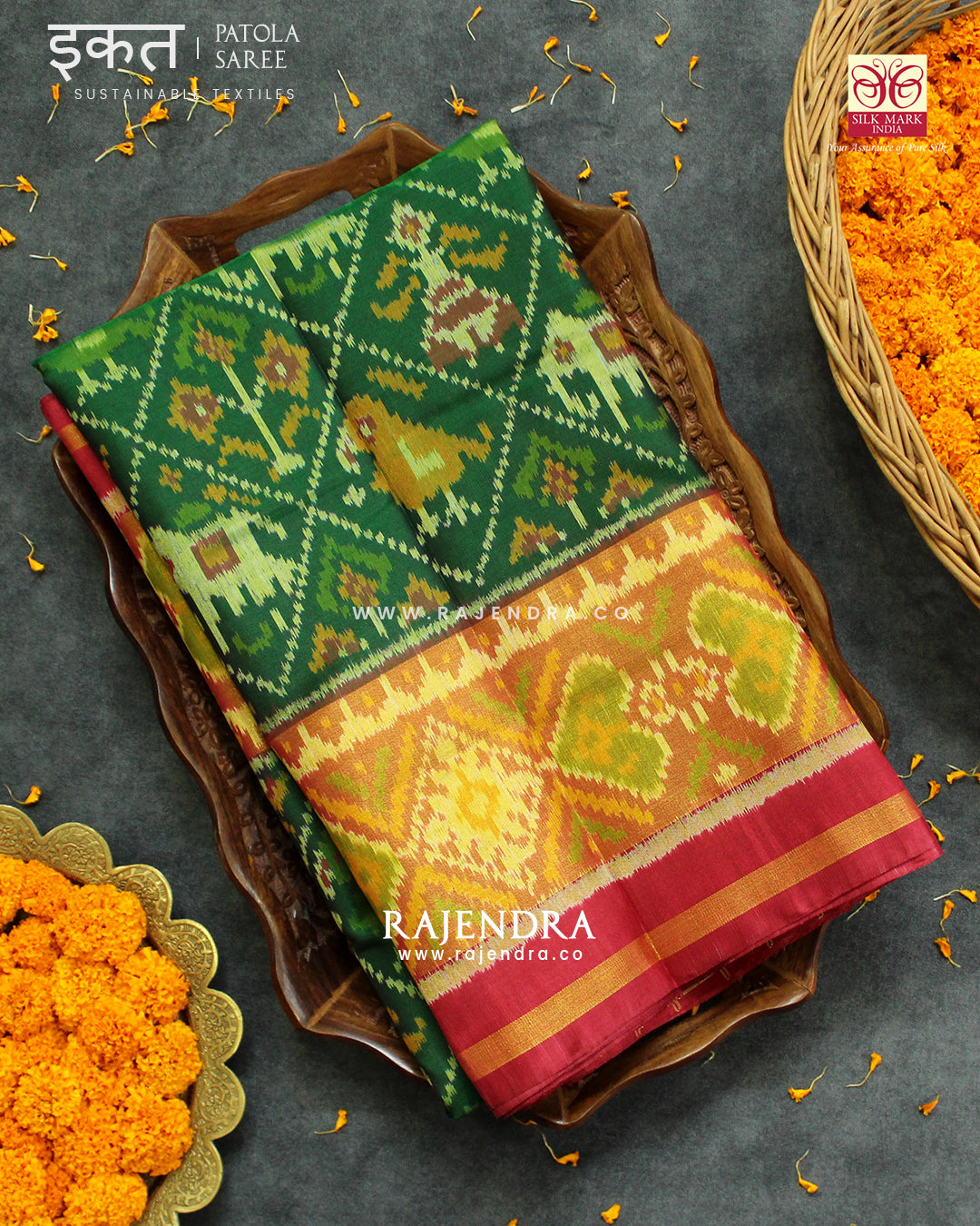 Traditional Elephant and Parrot Motif Red and Green Single Ikat Rajkot Patola Saree