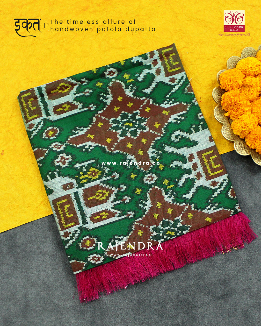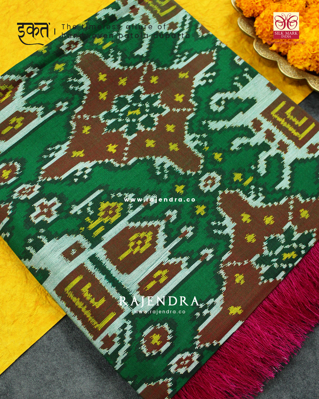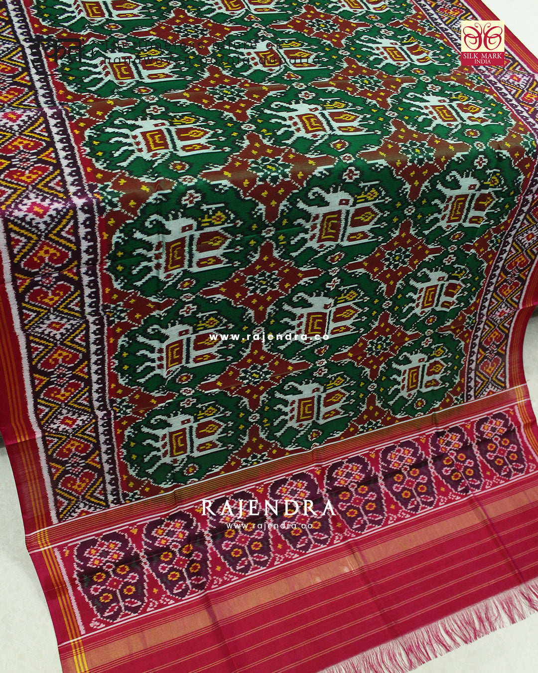 Traditional Elephant Motif Pink Green Ikat Rajkot Patola Dupatta