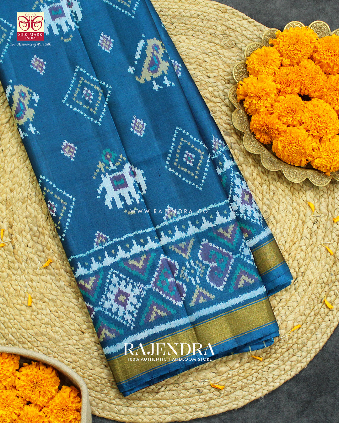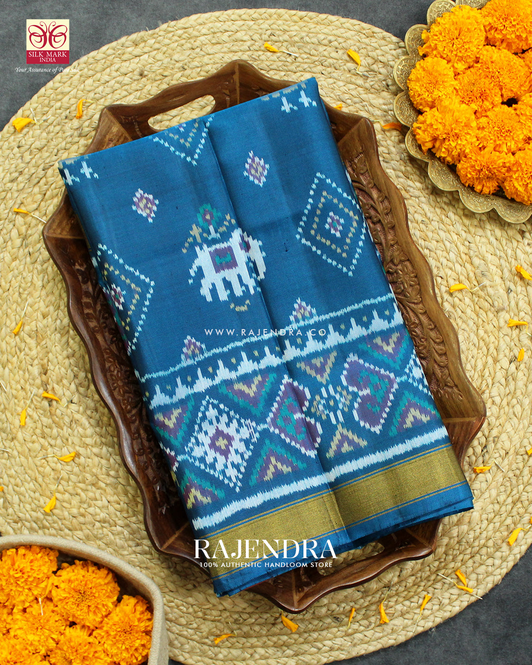 Traditional Hathi Chanda Design Rama Blue Single Ikat Rajkot Patola Saree