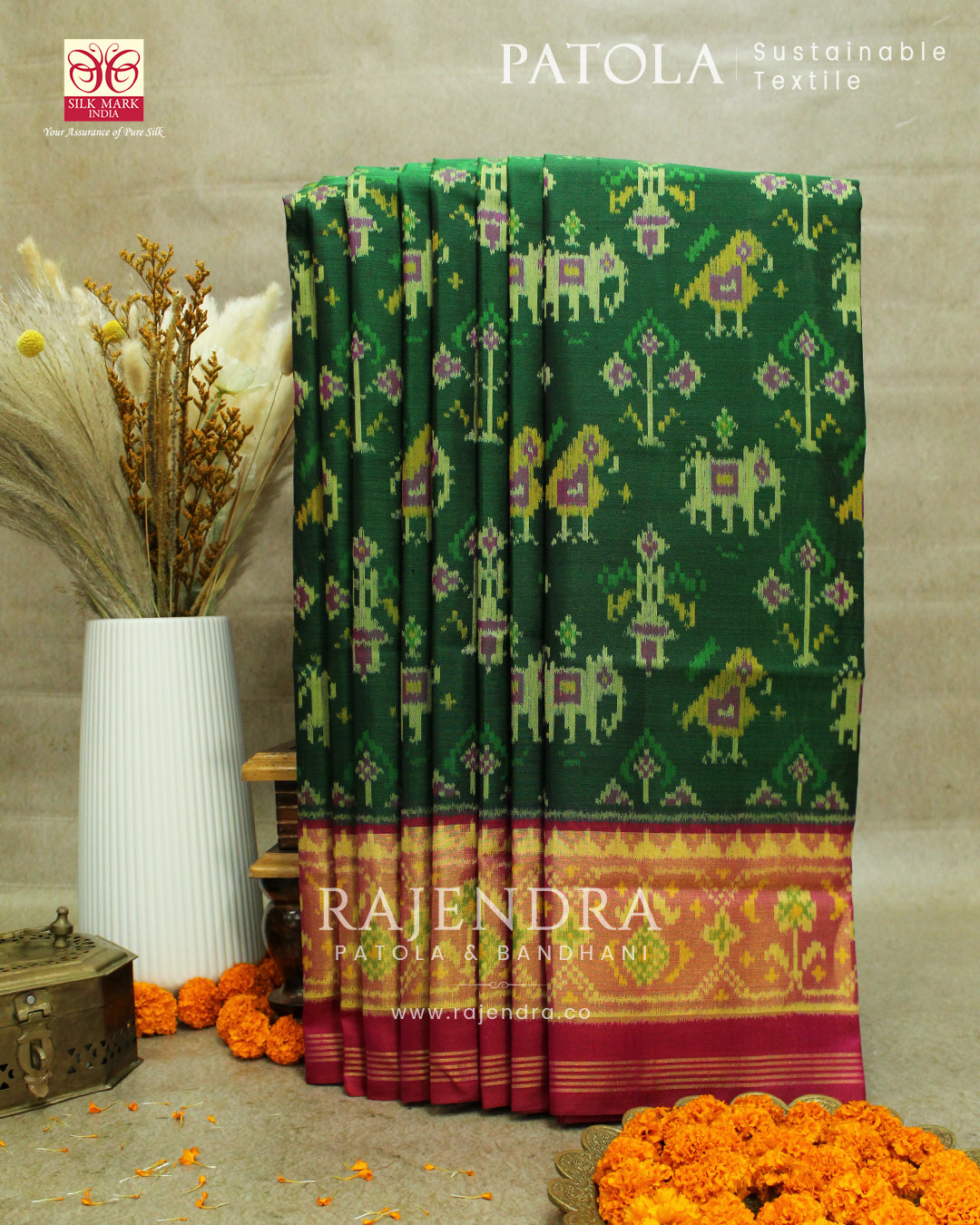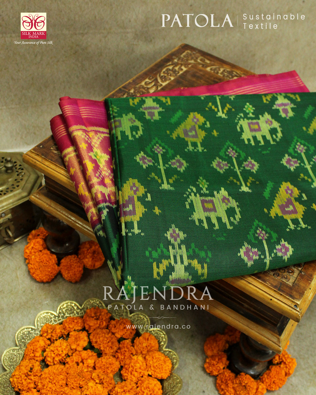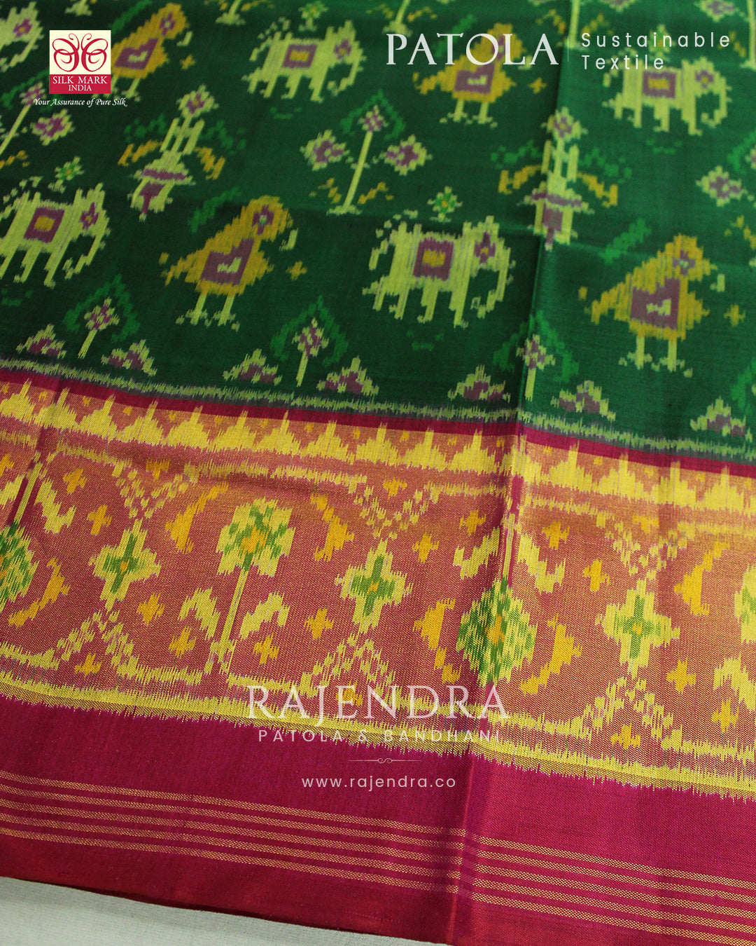 Traditional Hathi Popat Bhat Pink Green Single Ikat Rajkot Patola Saree