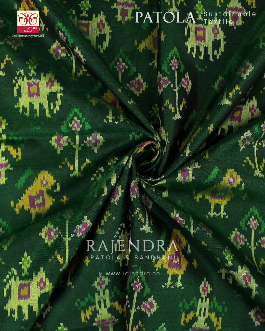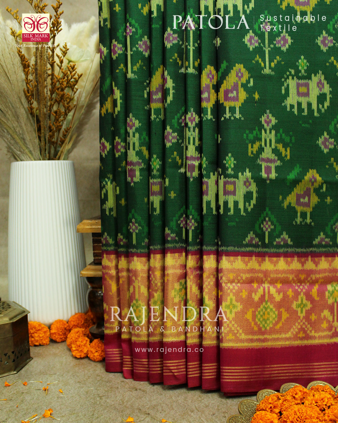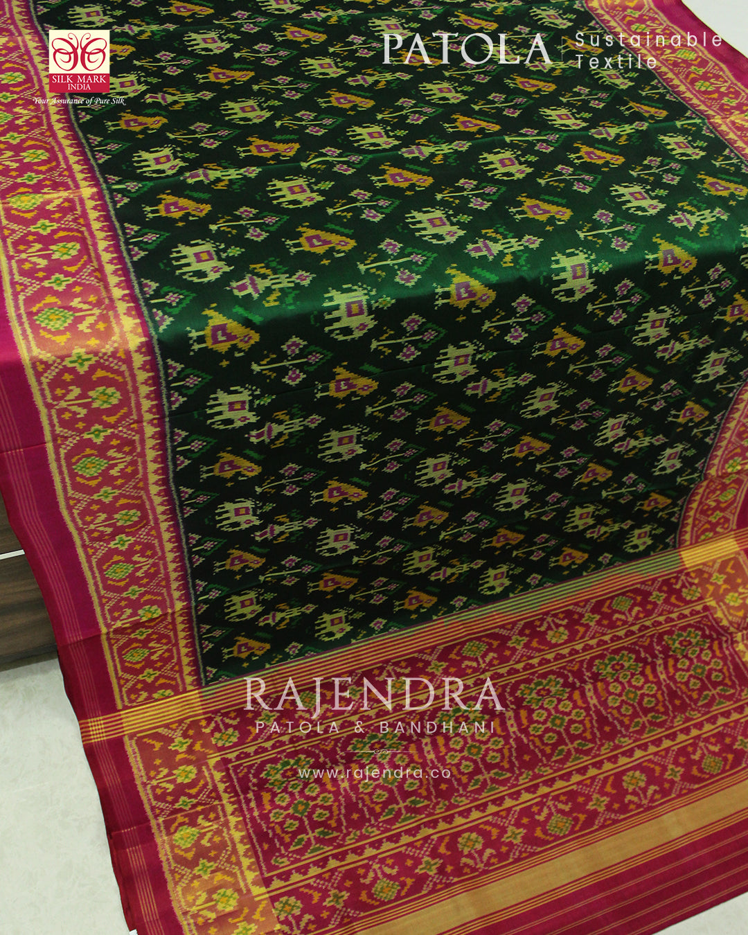 Traditional Hathi Popat Bhat Pink Green Single Ikat Rajkot Patola Saree