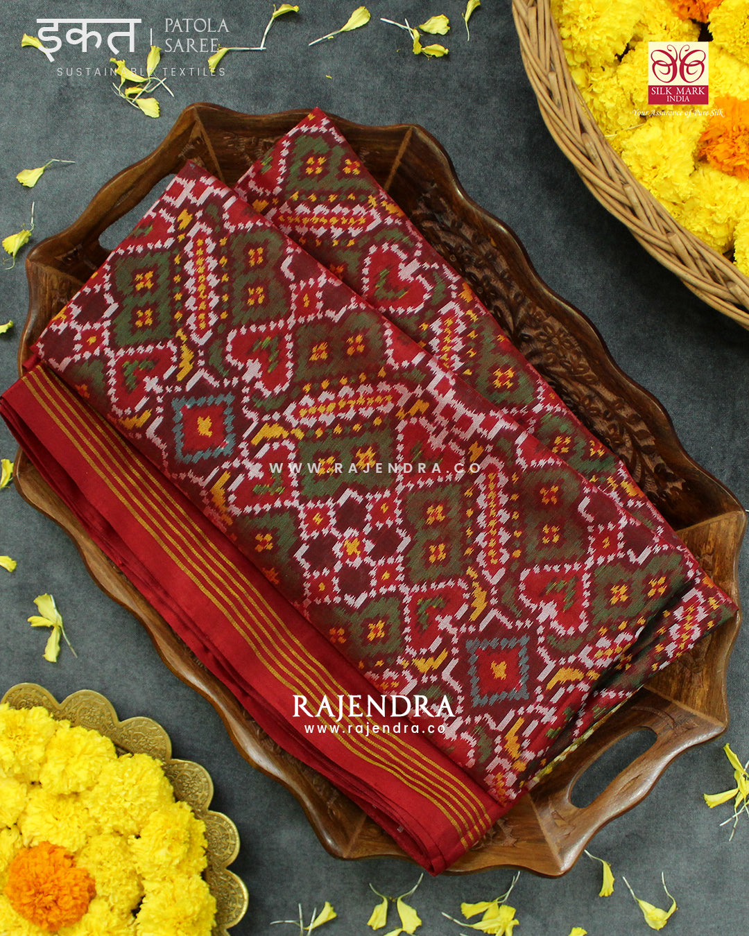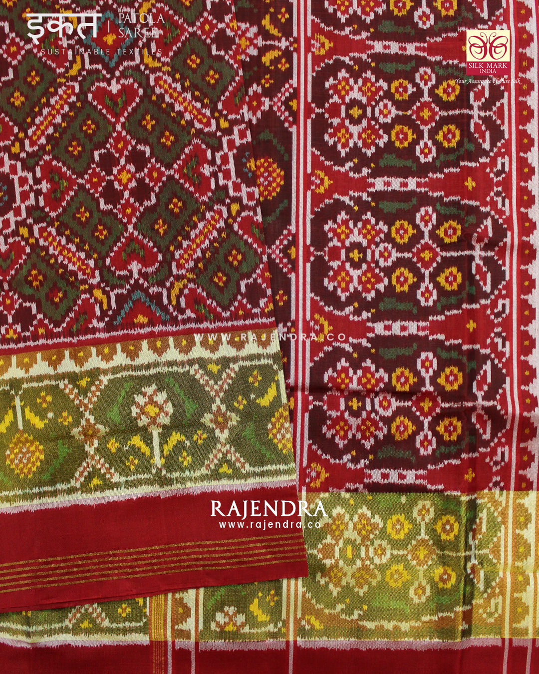 Traditional Manekchowk Bhat Red and Green Single Ikat Rajkot Patola Saree