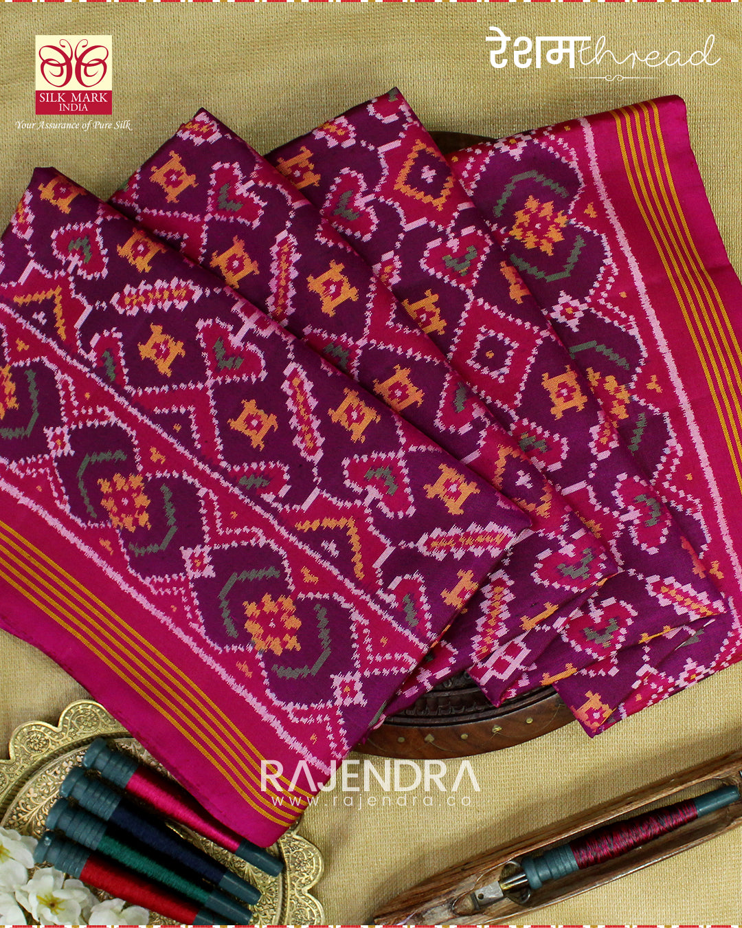 We are govt. approved silk mark certified store for heirloom rajkot patola saree. Authentic silk mark tag with all purchase and secure payment options. Whenever you buy silk make sure it has a silk mark label. The only symbol of purity of silk: the silk mark label. Rajendra Patola assures 100% Silk with Silk mark label.