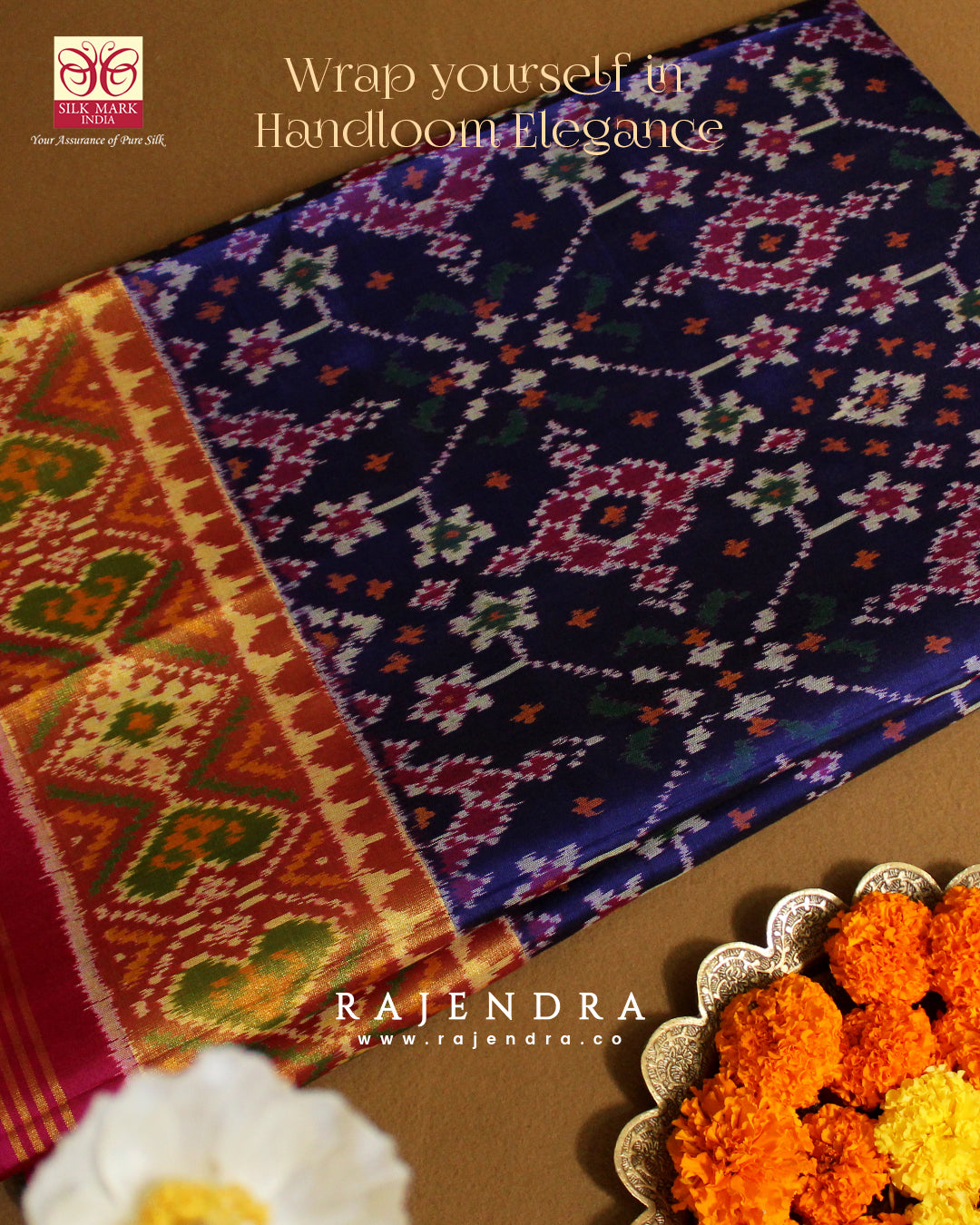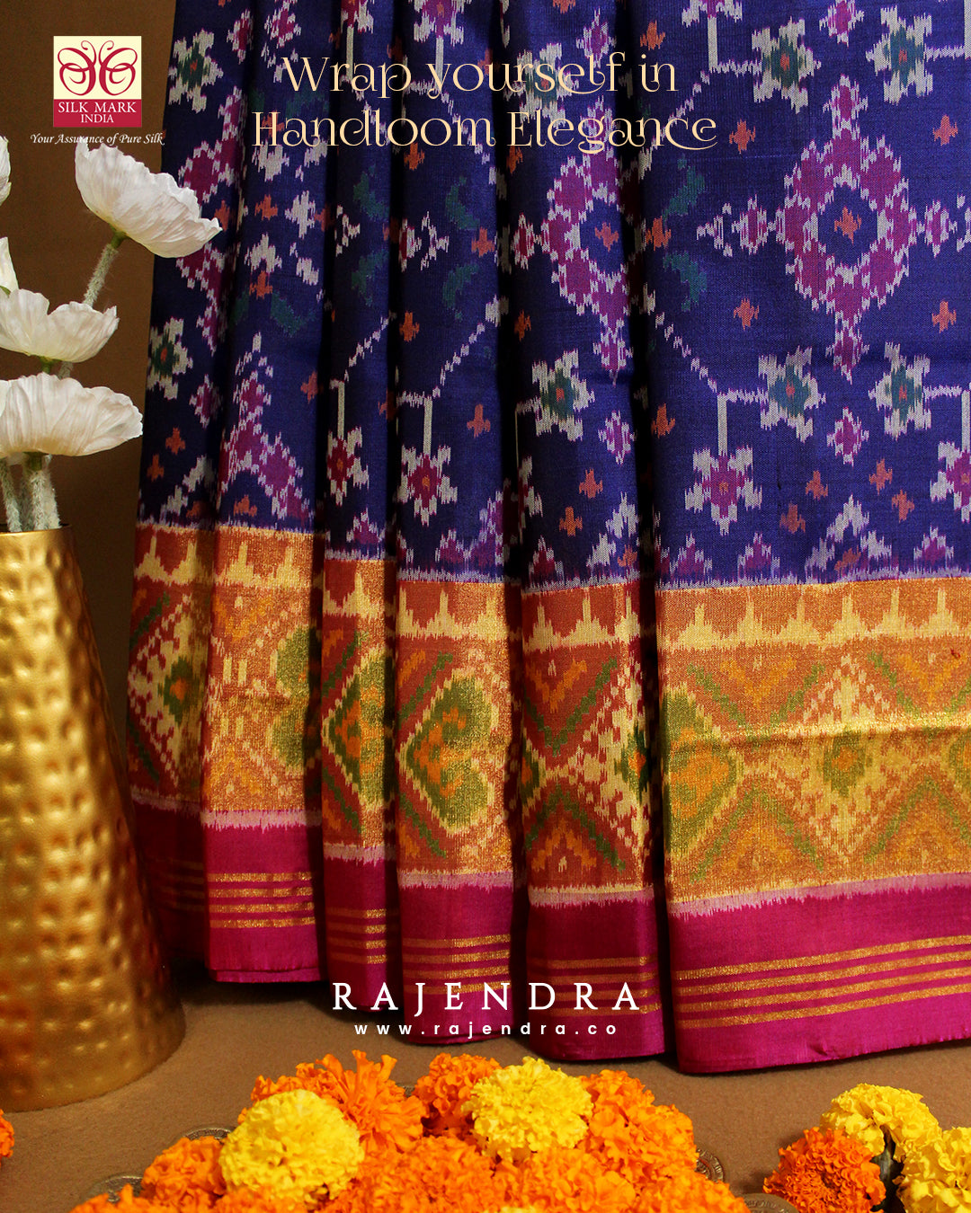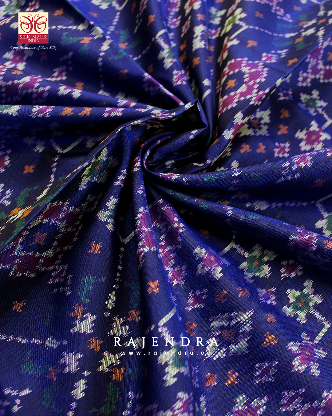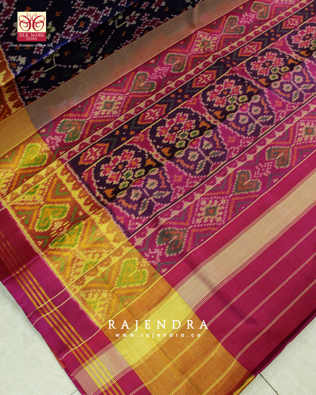We are govt. approved silk mark certified store for heirloom rajkot patola saree. Authentic silk mark tag with all purchase and secure payment options. Whenever you buy silk make sure it has a silk mark label. The only symbol of purity of silk: the silk mark label. Rajendra Patola assures 100% Silk with Silk mark label.