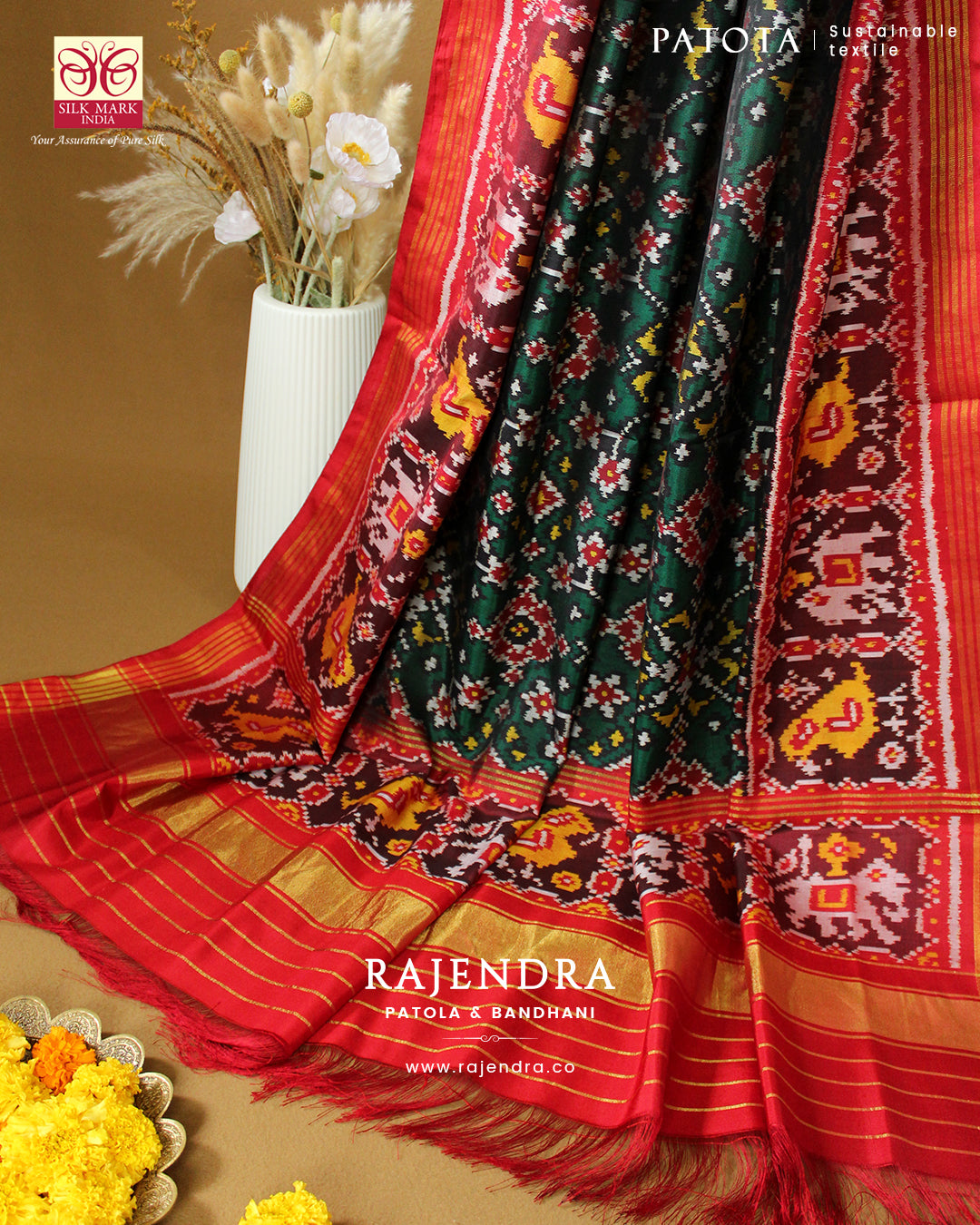 We are govt. approved silk mark certified store for heirloom rajkot patola saree. Authentic silk mark tag with all purchase and secure payment options. Whenever you buy silk make sure it has a silk mark label. The only symbol of purity of silk: the silk mark label. Rajendra Patola assures 100% Silk with Silk mark label.