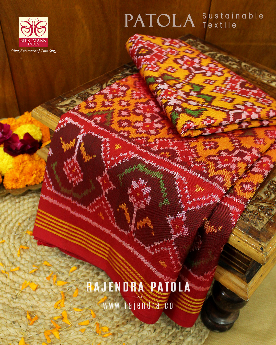 We are govt. approved silk mark certified store for heirloom rajkot patola saree. Authentic silk mark tag with all purchase and secure payment options. Whenever you buy silk make sure it has a silk mark label. The only symbol of purity of silk: the silk mark label. Rajendra Patola assures 100% Silk with Silk mark label.