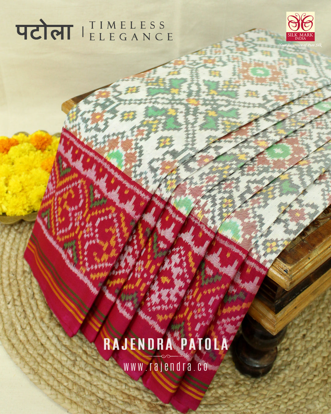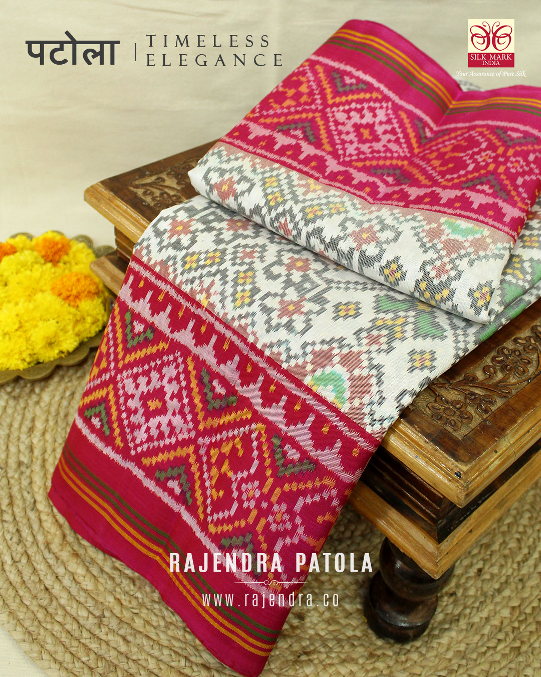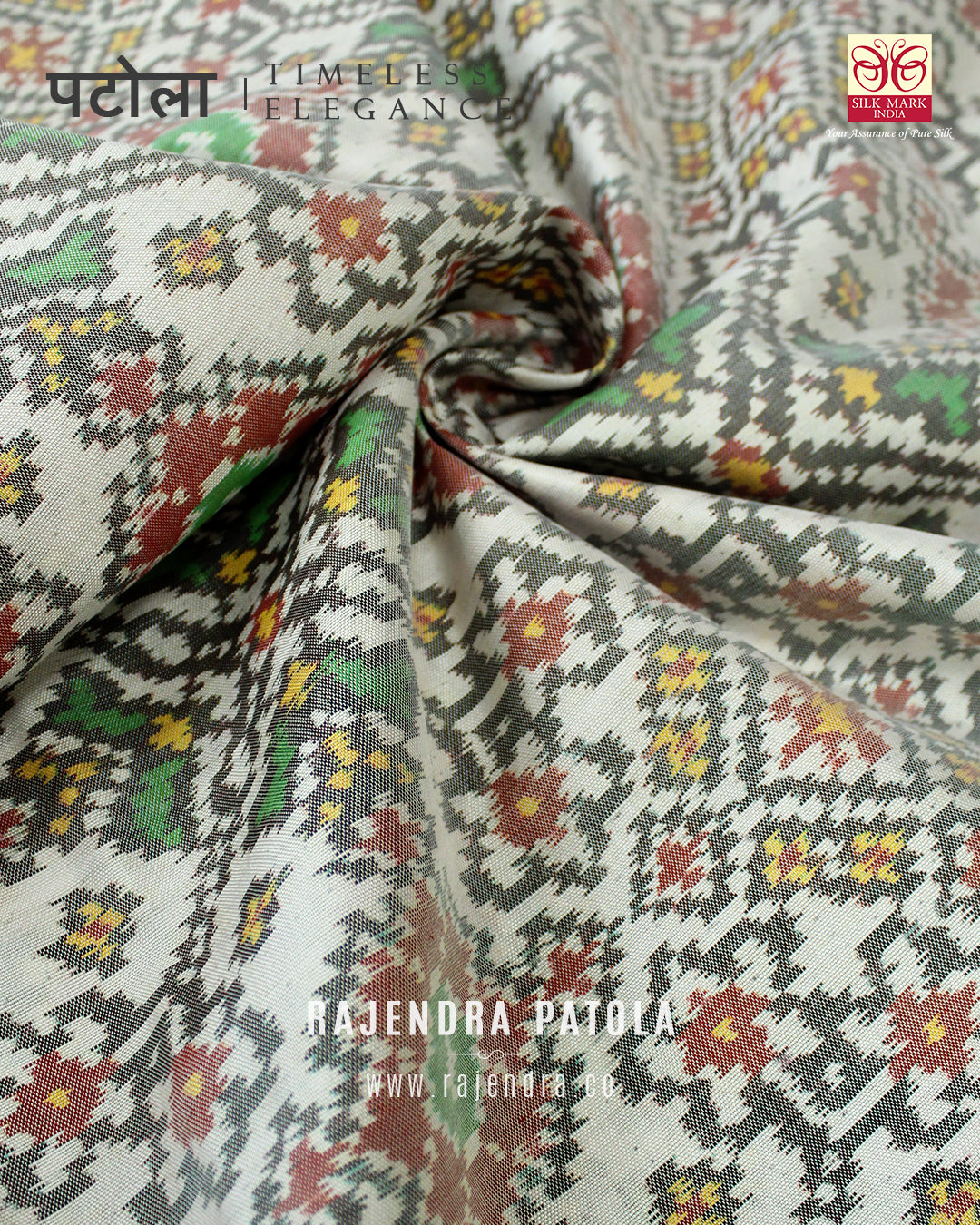 We are govt. approved silk mark certified store for heirloom rajkot patola saree. Authentic silk mark tag with all purchase and secure payment options. Whenever you buy silk make sure it has a silk mark label. The only symbol of purity of silk: the silk mark label. Rajendra Patola assures 100% Silk with Silk mark label.