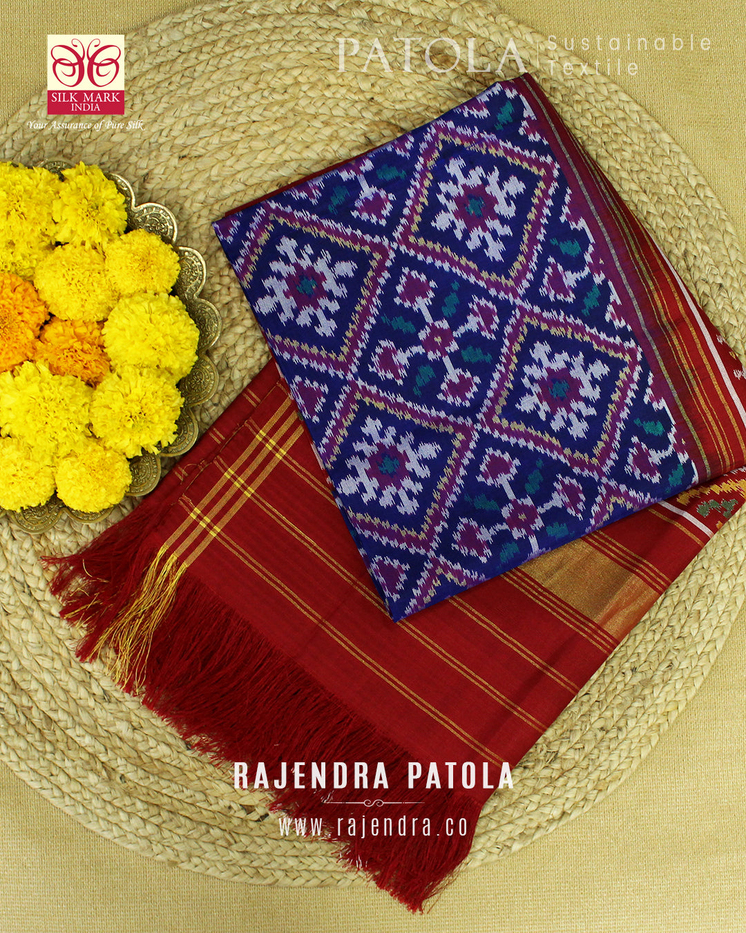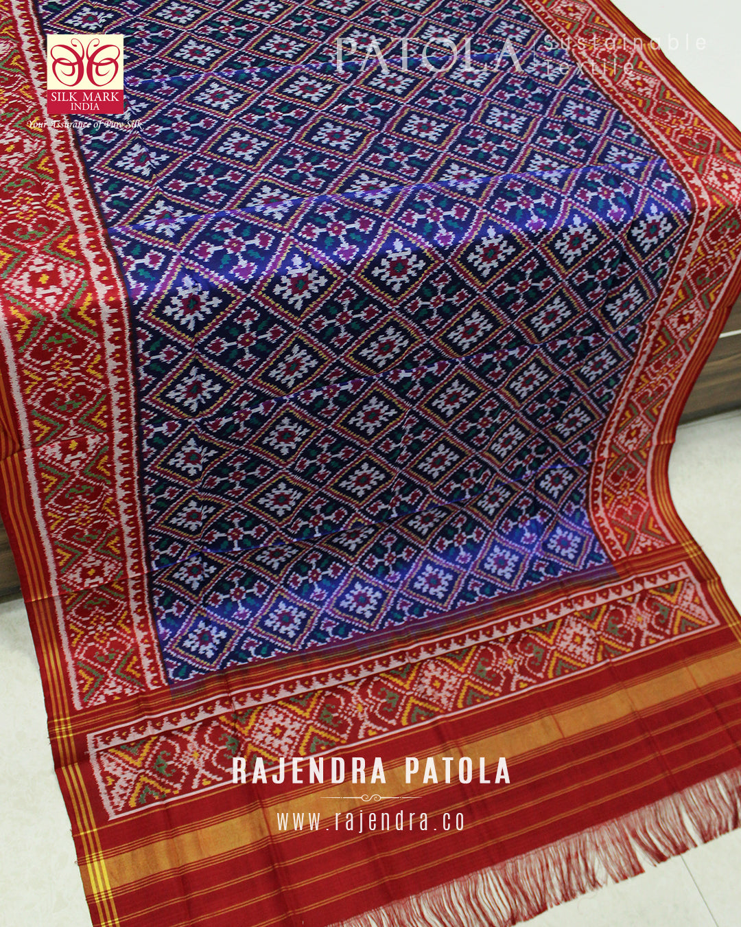 We are govt. approved silk mark certified store for heirloom rajkot patola saree. Authentic silk mark tag with all purchase and secure payment options. Whenever you buy silk make sure it has a silk mark label. The only symbol of purity of silk:  the silk mark label. Rajendra Patola assures 100% Silk with Silk mark label.
